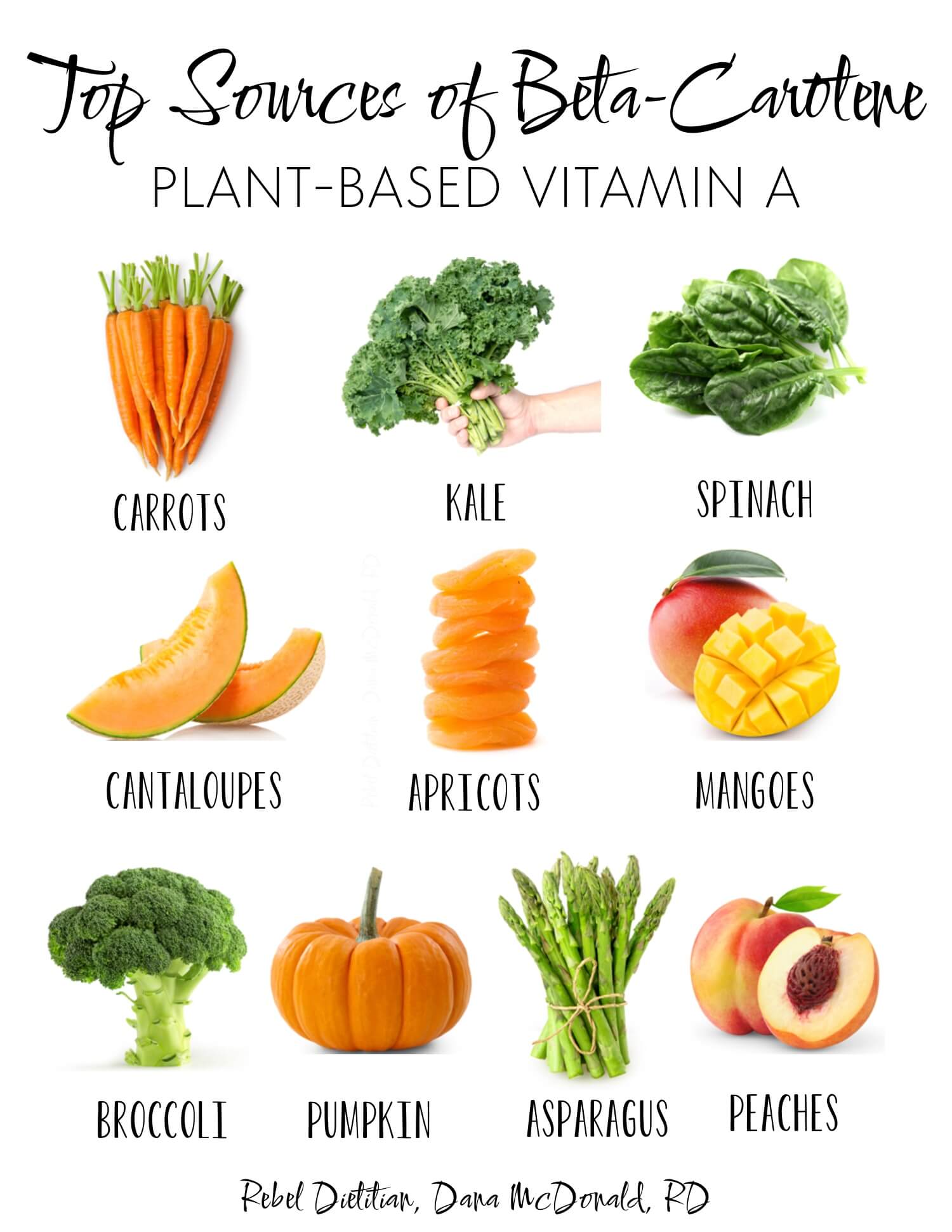 อาหารที่มีวิตามินเอโดยธรรมชาติ อยู่ในผักใบเขียว ใบเหลือง ไข่แดง ตับ นม เนย ปลา มะเขือเทศ แครอท เป็นต้น โดยวิตามินเอ ที่ได้จากเนื้อสัตว์จะดูดซึมได้ดีกว่า ในด้านของตัววิตามิน หรืออาหารเสริม จะมีการนำวิตามินเอมาผสมในปริมาณ 5,000 - 10,000 IU ซึ่งถือว่าเป็นปริมาณ ที่กำลังพอดีต่อร่างกาย และได้มีการนำมาทำแบบเป็นน้ำ เพื่อใช้ประโยชน์ในการทานเพิ่มขึ้นอีกด้วย